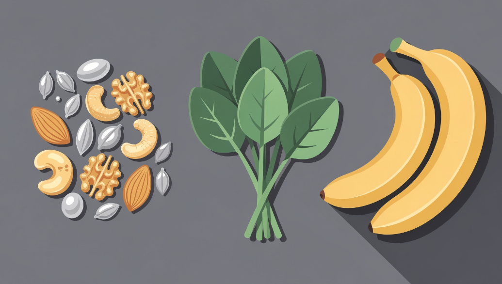 마그네슘이 풍부한 음식(견과류, 시금치, 바나나, 해조류)을 꾸준히 섭취합니다.