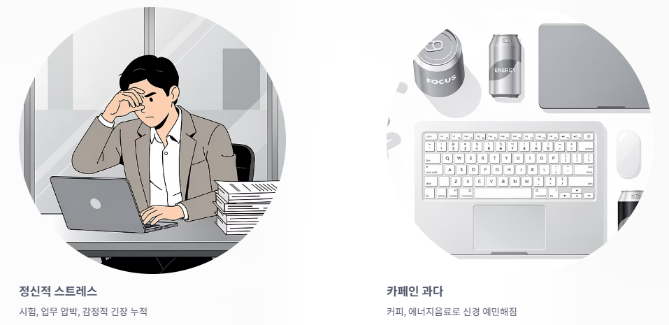 정신적 스트레스는 자율신경계를 자극해 근육 경련을 유발합니다. 시험, 업무 압박, 감정적 긴장이 누적될수록 눈밑 떨림이 잦아질 수 있습니다.