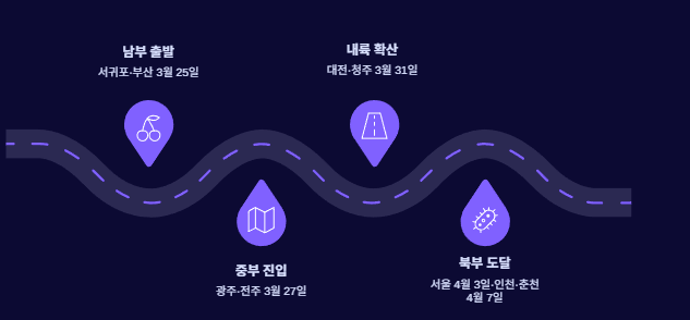 | 광주/전주 | 3월 27일~28일 | 4월 3일 ~ 4월 4일 | 평년 대비 4~6일 빠름 |