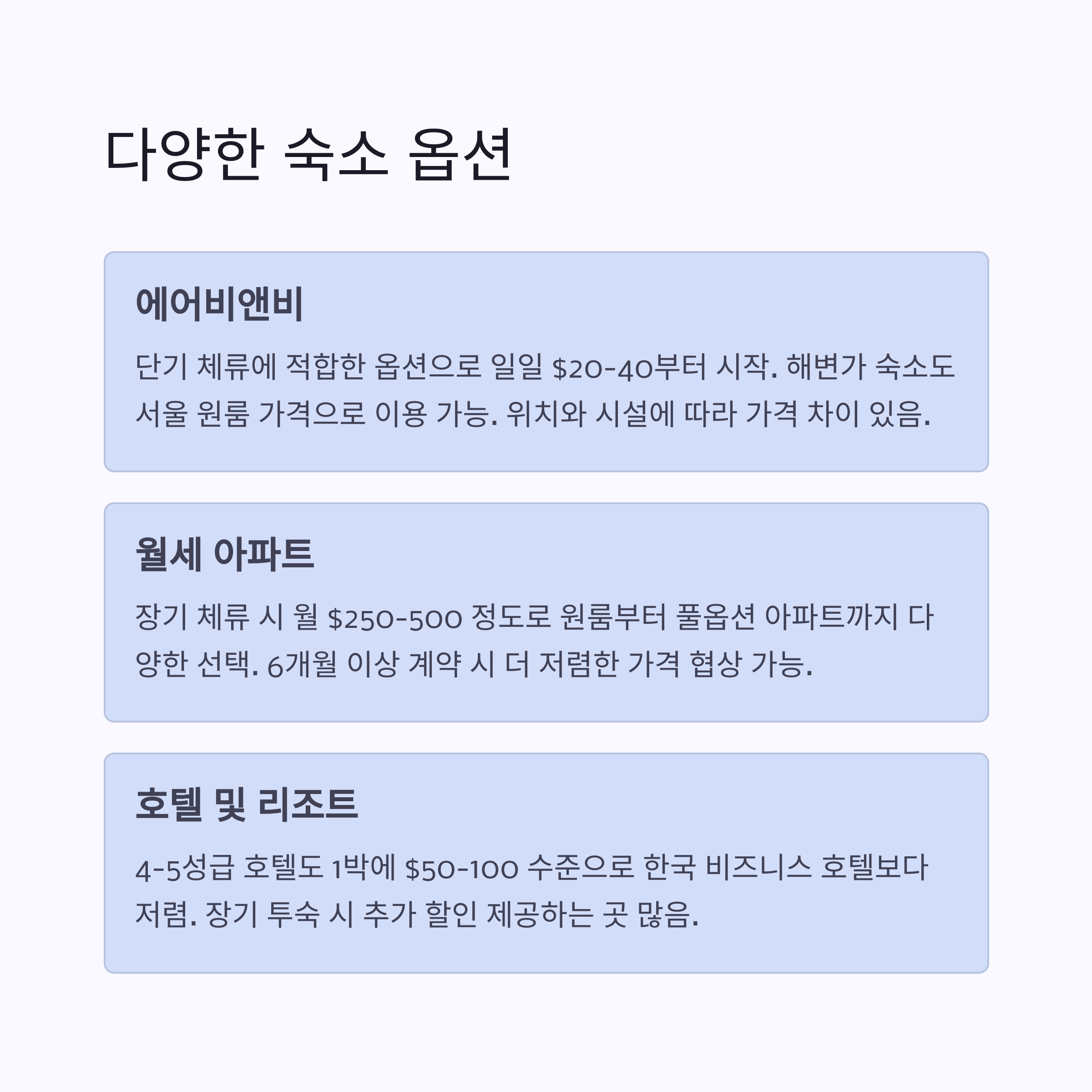 숙소는 장기 임대와 에어비앤비 모두 선택할 수 있습니다. 장기 임대는 Facebook 그룹이나 현지 에이전트를 통해 저렴하게 구할 수 있으며, 1인실 스튜디오는 약 750~800달러, 2인실은 1,100~1,300달러 수준입니다. 단기 여행자라면 하루 6~15달러의 호스텔, 저가 호텔도 충분히 좋은 선택이 될 수 있습니다. 특히 숙소 선택 시에는 위치와 주변 환경, 서비스 조건 등을 꼼꼼히 따져보는 것이 중요합니다.