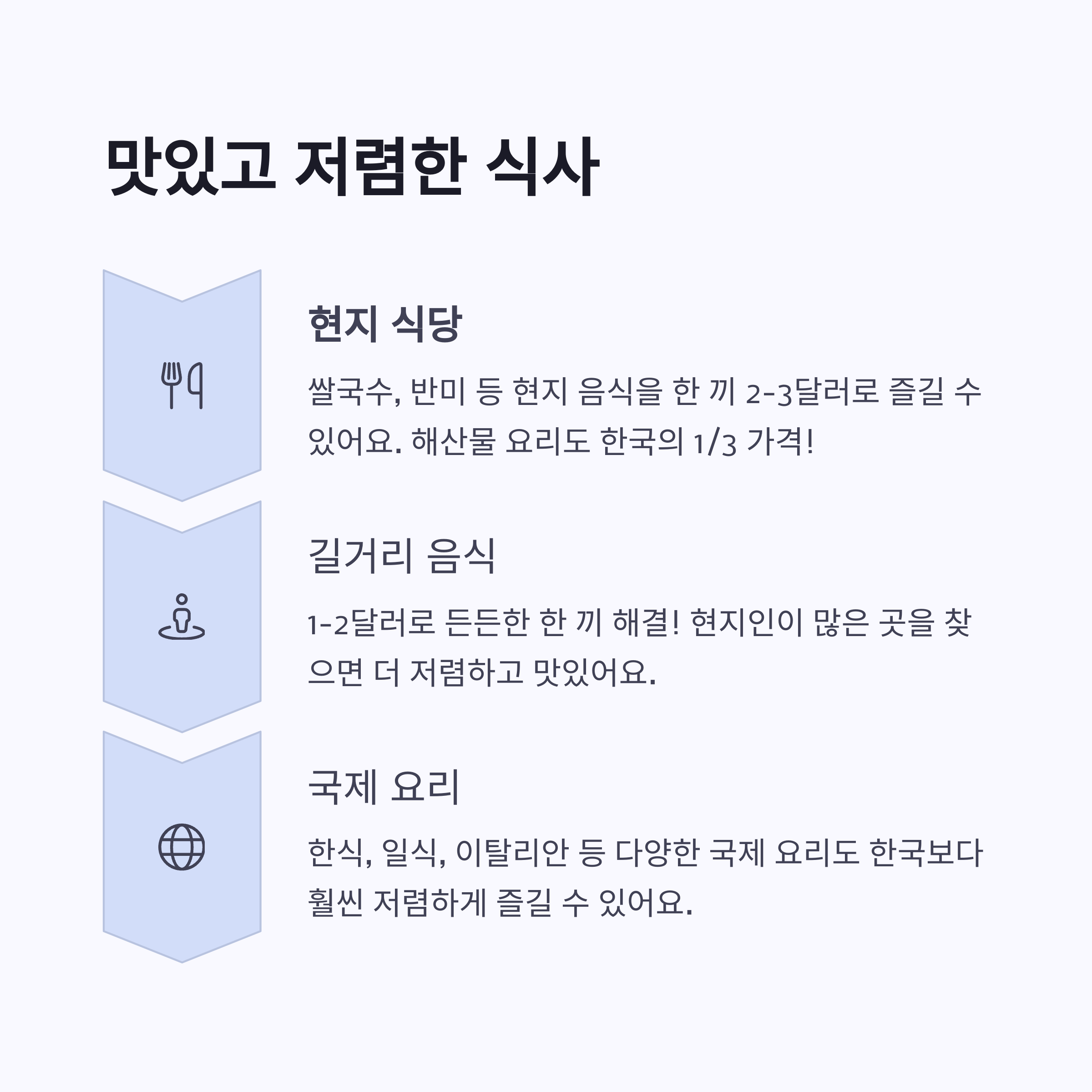 | 전반적으로 동남아 도시 중 높은 가성비 | 에이전트보다 직접 임대 시 더 저렴한 비용 | 식비 예산은 하루 10달러로도 충분 |