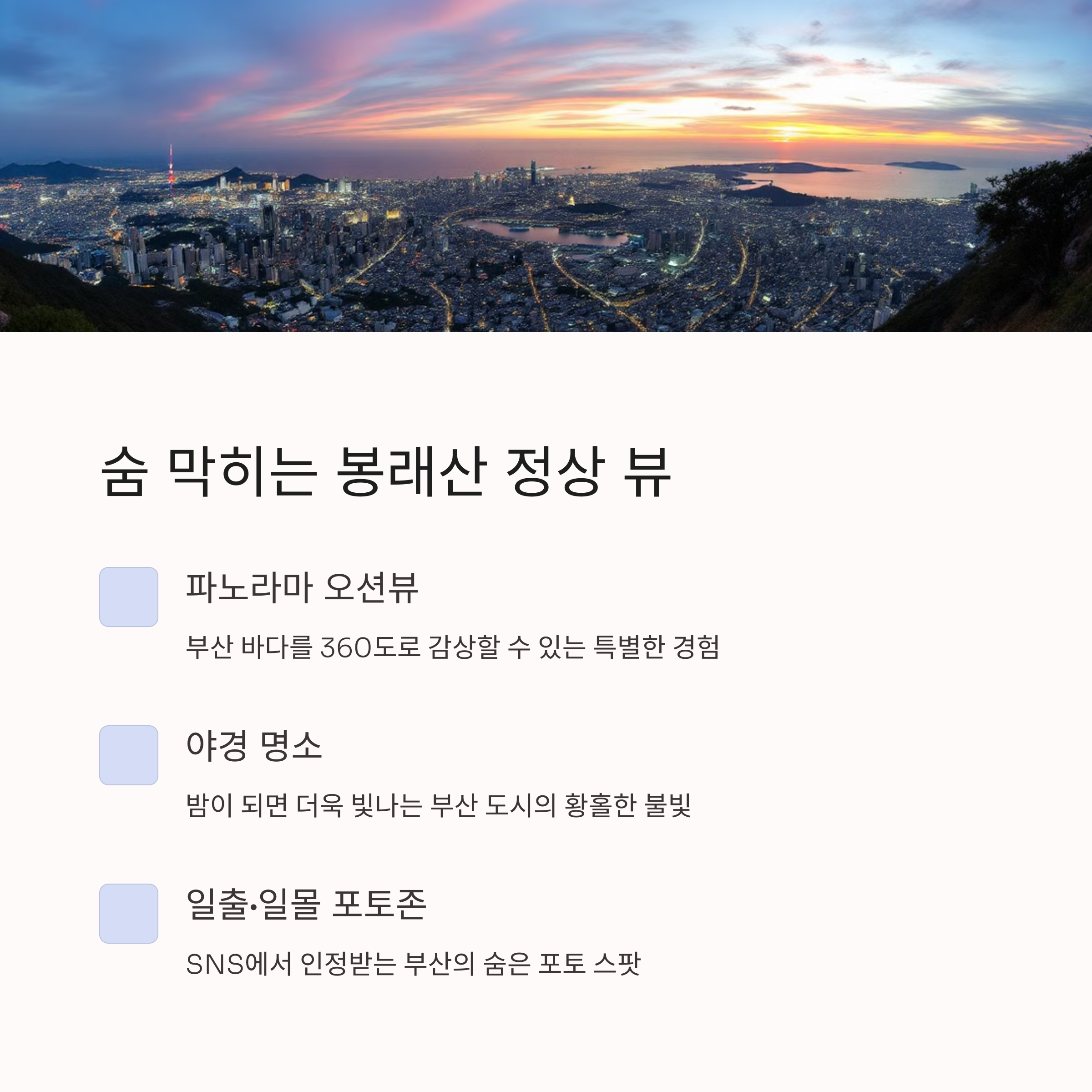 봉래산 정상에서는 부산의 동서남북을 한눈에 담을 수 있고, 일몰 후에는 반짝이는 야경을 즐길 수 있습니다.