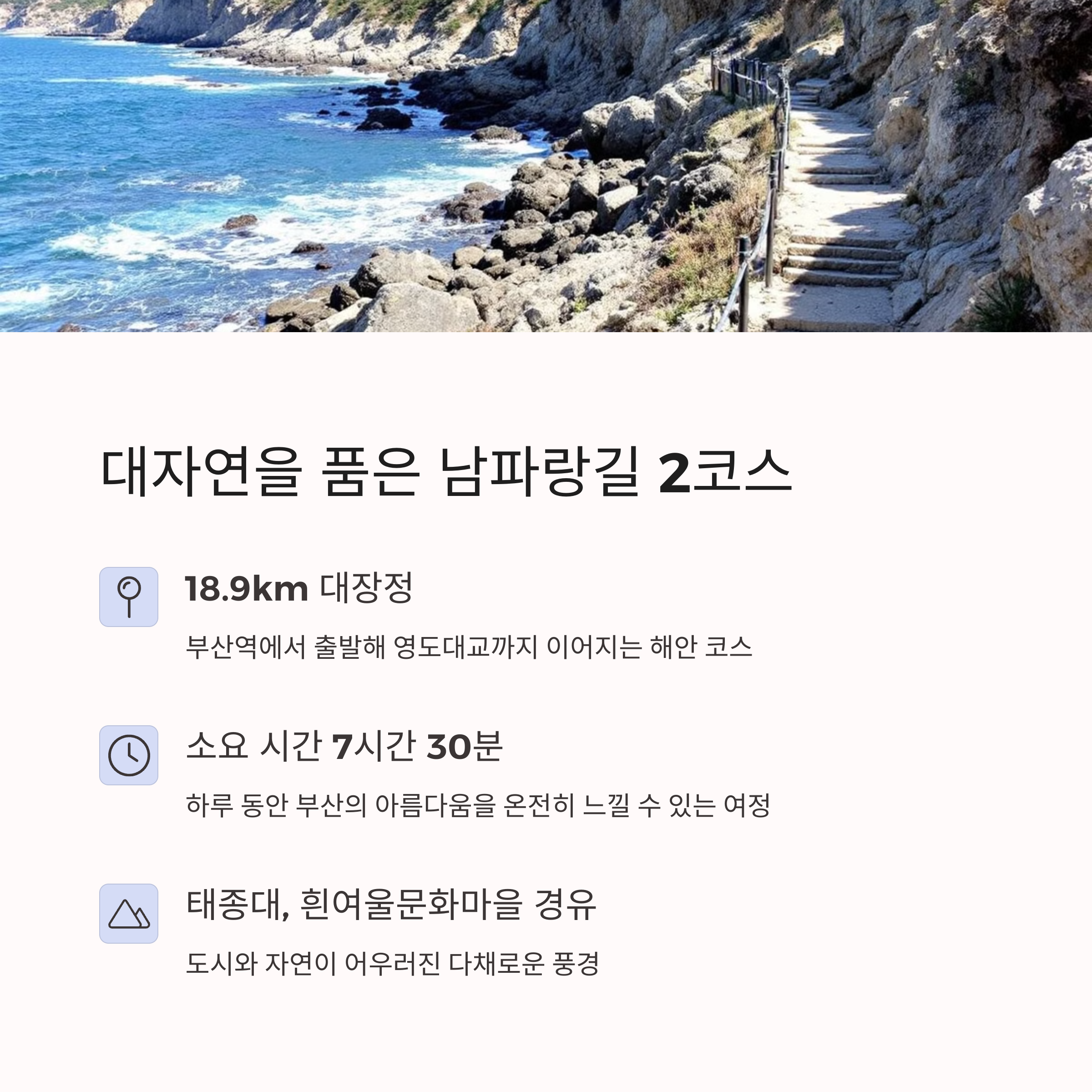 | 남파랑길 2코스는 다양한 매력을 가진 긴 거리의 코스입니다. 이 코스는 총 18.9km의 거리로 부산역에서 출발하여 봉래산, 태종대, 그리고 흰여울문화마을을 거쳐갑니다. 태종대에서는 드넓은 바다와 부산의 절경을 감상할 수 있는 것으로 유명합니다. 흰여울문화마을에서는 한눈에 들어오는 바다 풍경과 예술적인 벽화를 즐길 수 있습니다. 길 자체가 부산의 역사와 자연, 그리고 문화적인 매력을 심도 있게 느낄 수 있도록 설계되었습니다. |