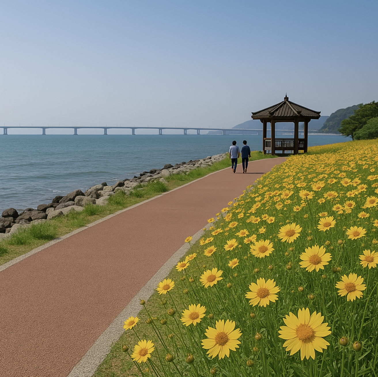 장림포구에서 다대포 해수욕장까지 이어지는 해안 산책로는 평소에도 지역 주민들의 산책 코스로 사랑받는 길이에요. 이 구간에 위치한 고니나루 쉼터 주변은 5월 말부터 6월 초 사이 금계국이 절정을 이루며 노란 꽃길을 연출합니다. 바다와 접해 있어 시원한 바람을 맞으며 걷기에 최적인 곳이기도 하죠. 이 구간을 걷다 보면 바다를 배경으로 펼쳐지는 노란 금계국 군락이 사진 명소로도 손색이 없습니다.
