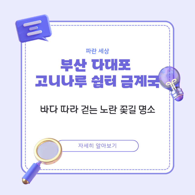 부산에서 초여름의 정취를 느끼고 싶다면 다대포 고니나루 쉼터 금계국이 최고의 선택입니다. 바다를 배경으로 노란 꽃길을 걷는 경험은 여느 관광지에서도 쉽게 접할 수 없는 특별한 순간이 될 거예요. 꽃과 자연, 그리고 여유로운 산책이 함께하는 부산 금계국 여행을 올여름 추천합니다.