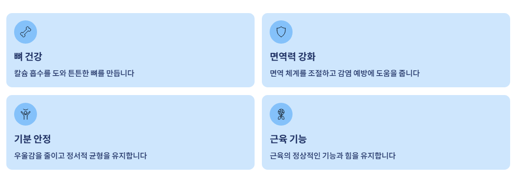 비타민D는 뼈 건강뿐 아니라 면역력, 기분 안정, 근육 기능에 중요한 역할을 합니다.