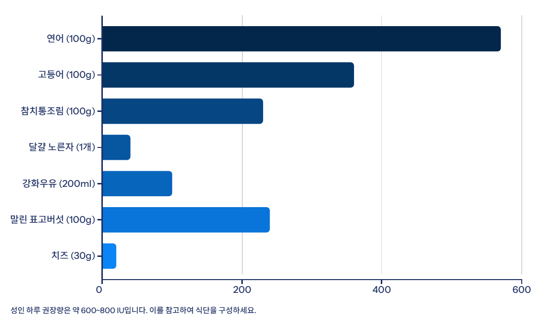 - 대표 음식: 등푸른 생선, 달걀, 우유·요거트, 시리얼, 버섯, 비건 강화 식품
