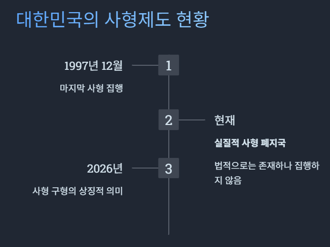 - 대한민국은 법적으로 사형제도가 존재하나, 1997년 이후 집행되지 않는 실질적 폐지국입니다.