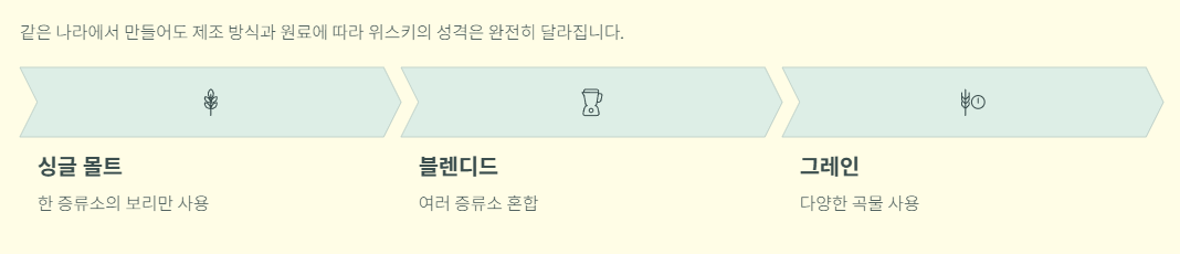 - 위스키는 원산지(스카치, 버번, 라이, 아이리시, 재패니즈 등)와