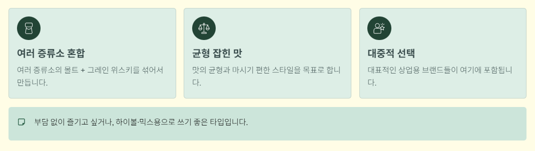 → 위스키 구조를 이해할 때 “블렌디드의 바탕이 되는 존재” 정도로 기억해두면 좋습니다.