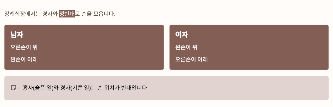 경사(기쁜 일)와 흉사(슬픈 일)는 손 위치가 완전히 반대라는 점이 핵심입니다.