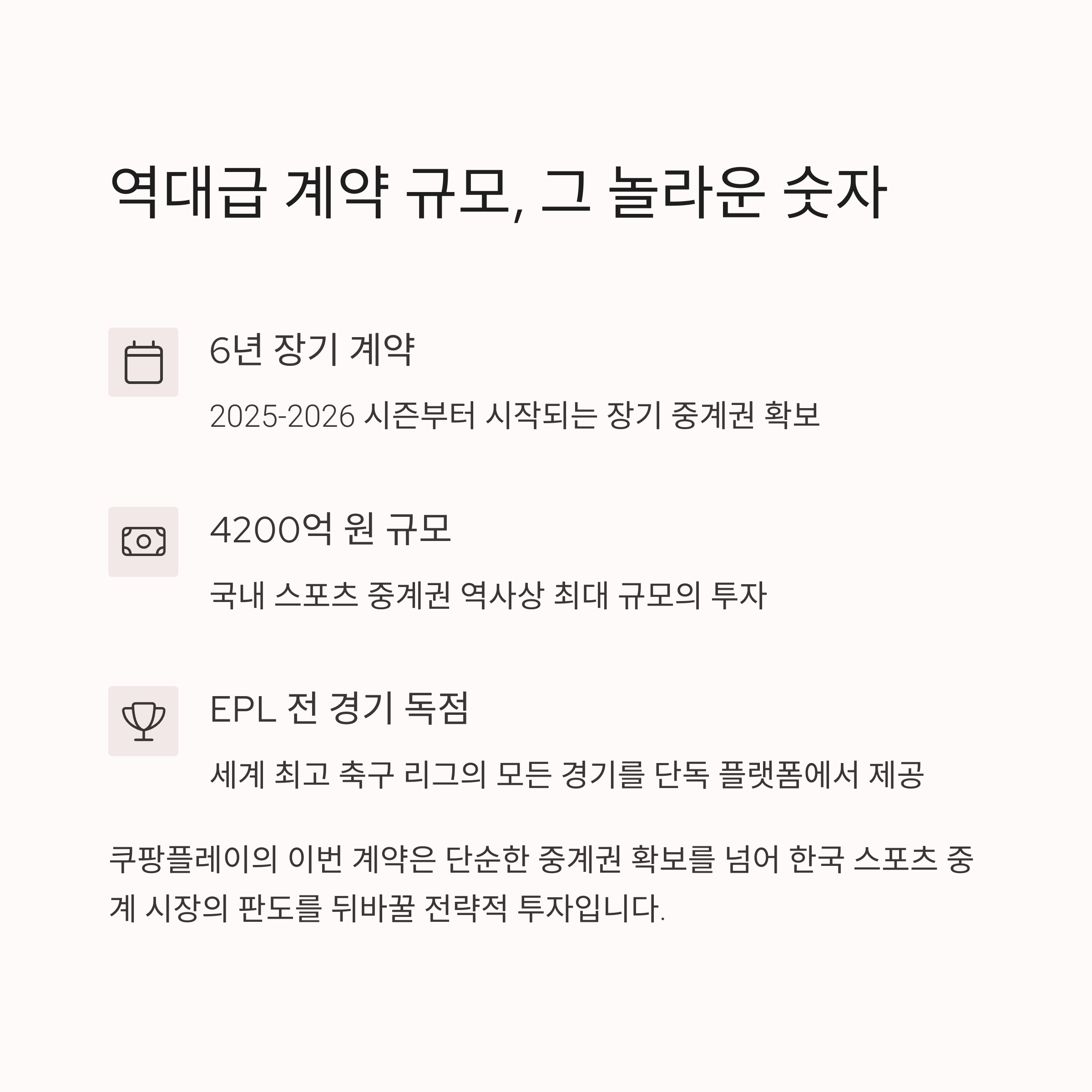 | 계약 기간 | 쿠팡플레이와 EPL의 파트너십은 총 6년간 지속됩니다. |