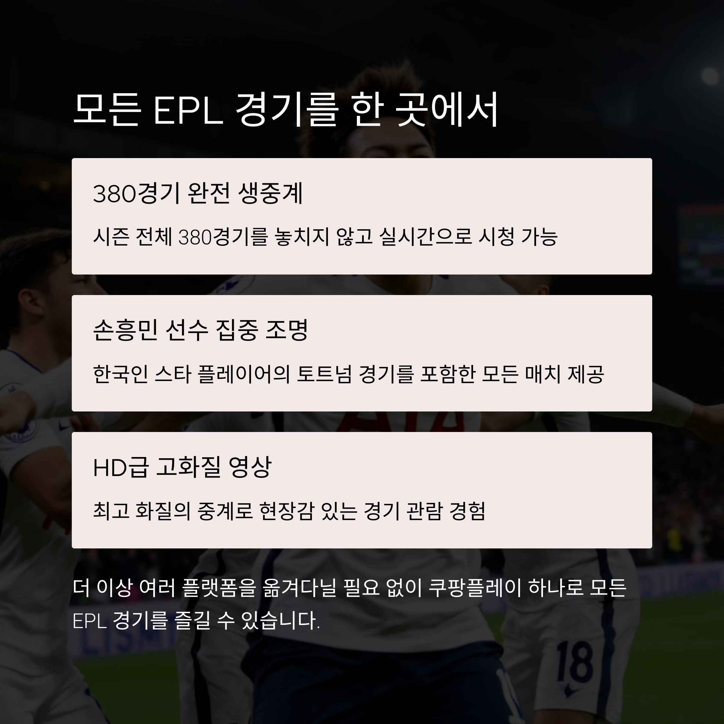 | EPL 전 경기 실시간 시청 가능 | 토트넘 경기 생중계 포함 | 인터뷰, 분석, 하이라이트 제공 |