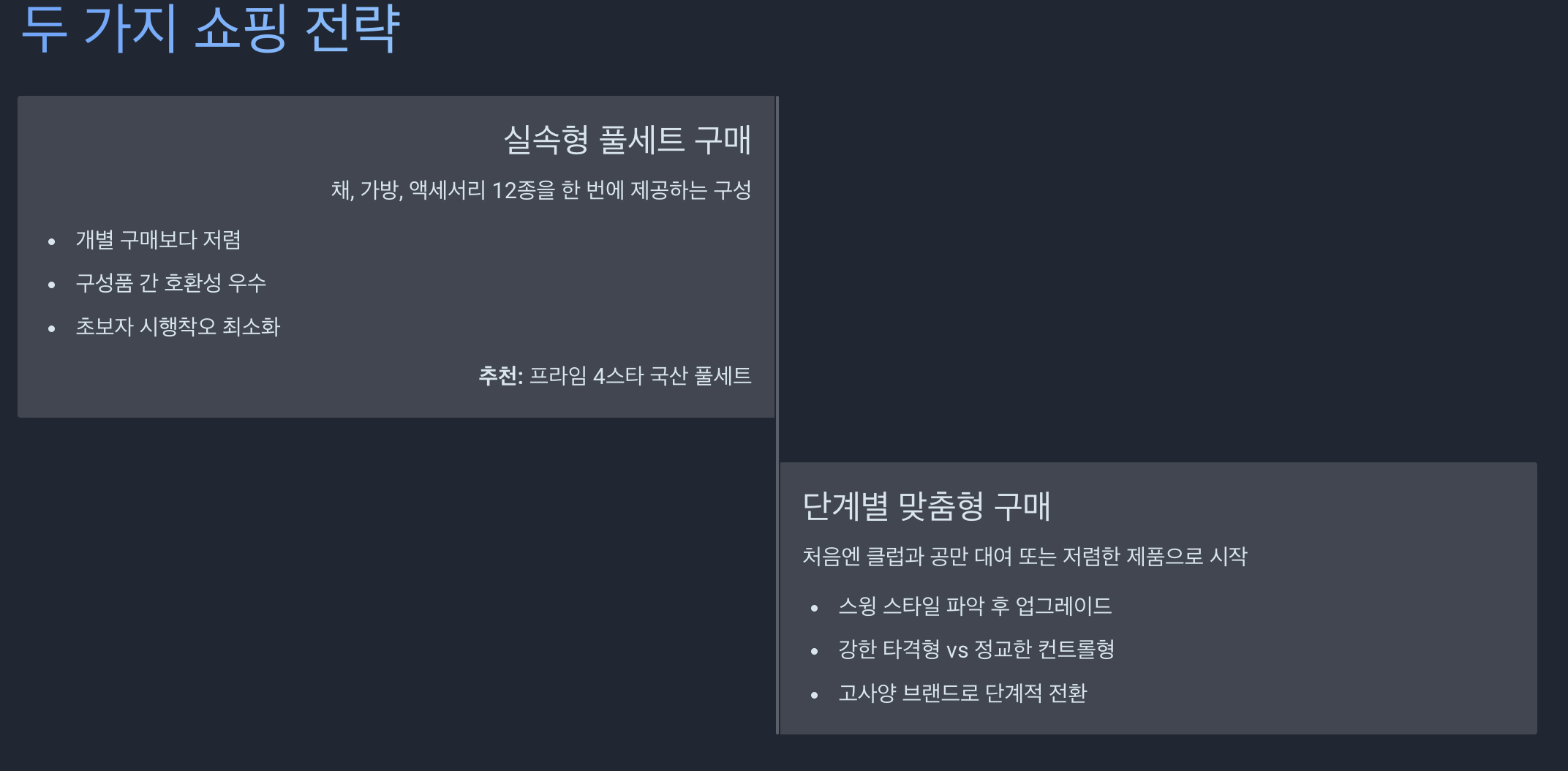 - 단계별 '맞춤형' 구매: 처음엔 클럽과 공만 대여하거나 저렴한 제품으로 시작한 뒤, 자신의 스윙 스타일(강한 타격형 vs 정교한 컨트롤형)이 파악되면 그에 맞는 고사양 브랜드로 업그레이드하는 방식입니다.