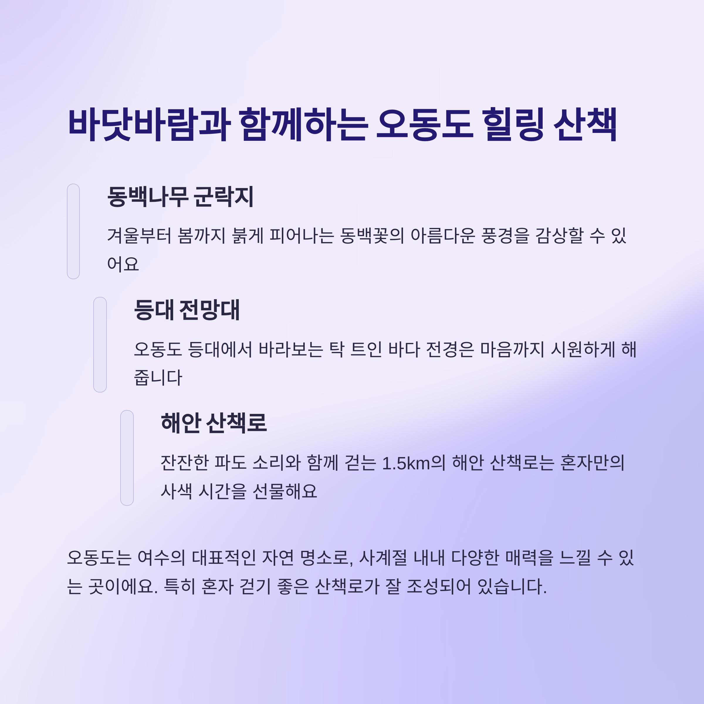 이번 여수 여행 이야기, 여러분은 어떻게 느끼셨나요? 혼자 여행을 가보고 싶은 생각이 드셨다면, 댓글로 자유롭게 의견과 경험을 남겨주세요. 더 많은 감성 여행 정보도 함께 나눌게요!