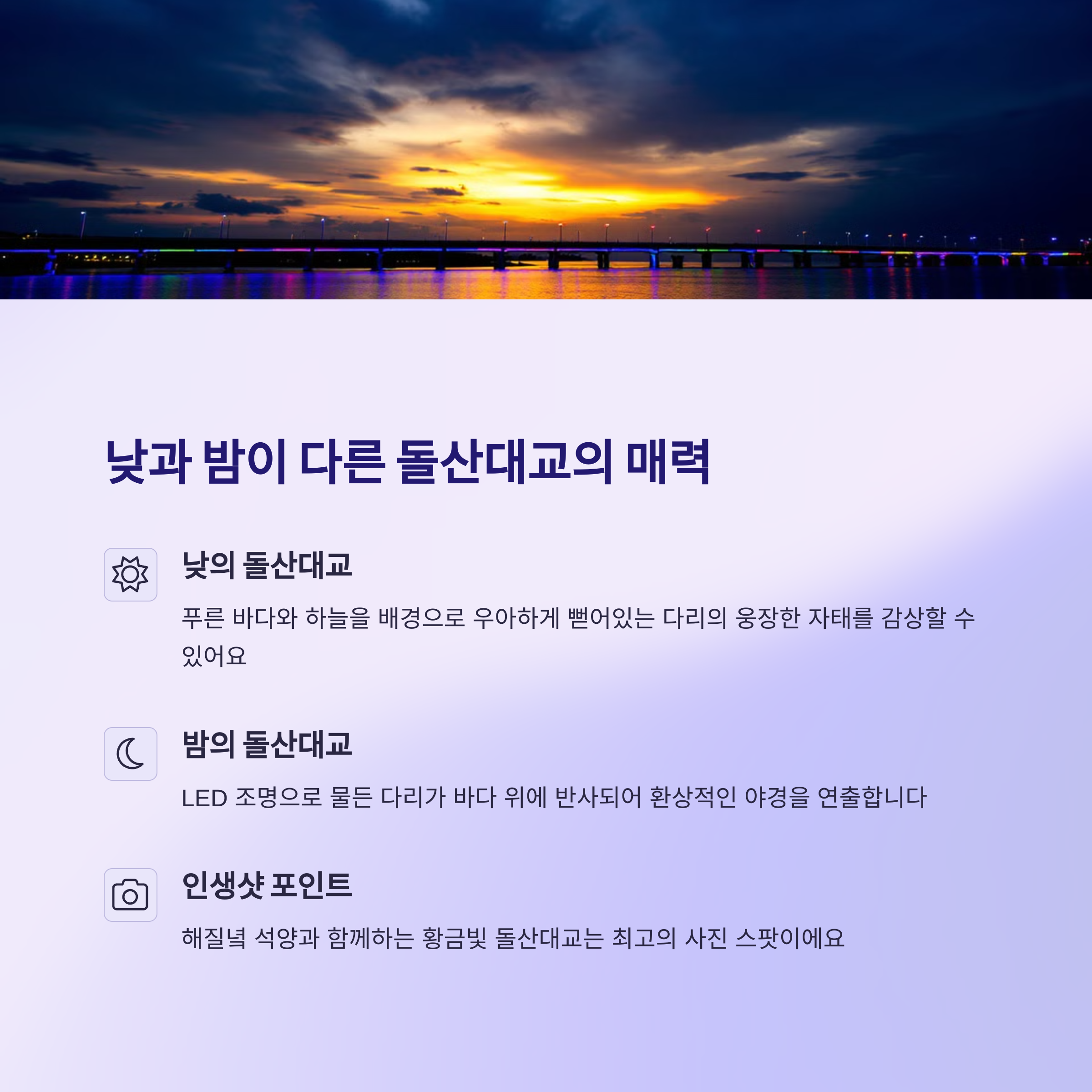 | 돌산과 자산을 연결하며 바다 위를 가로지름 | 동백꽃이 만개한 겨울철에 특히 아름다움 | 오션뷰, 인피니티풀, 플로팅 조식까지 다양함 |