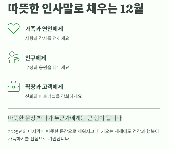 적절한 표현 한 줄이 관계를 깊게 만들고, 연말 분위기를 따뜻하게 바꾸어 줍니다.