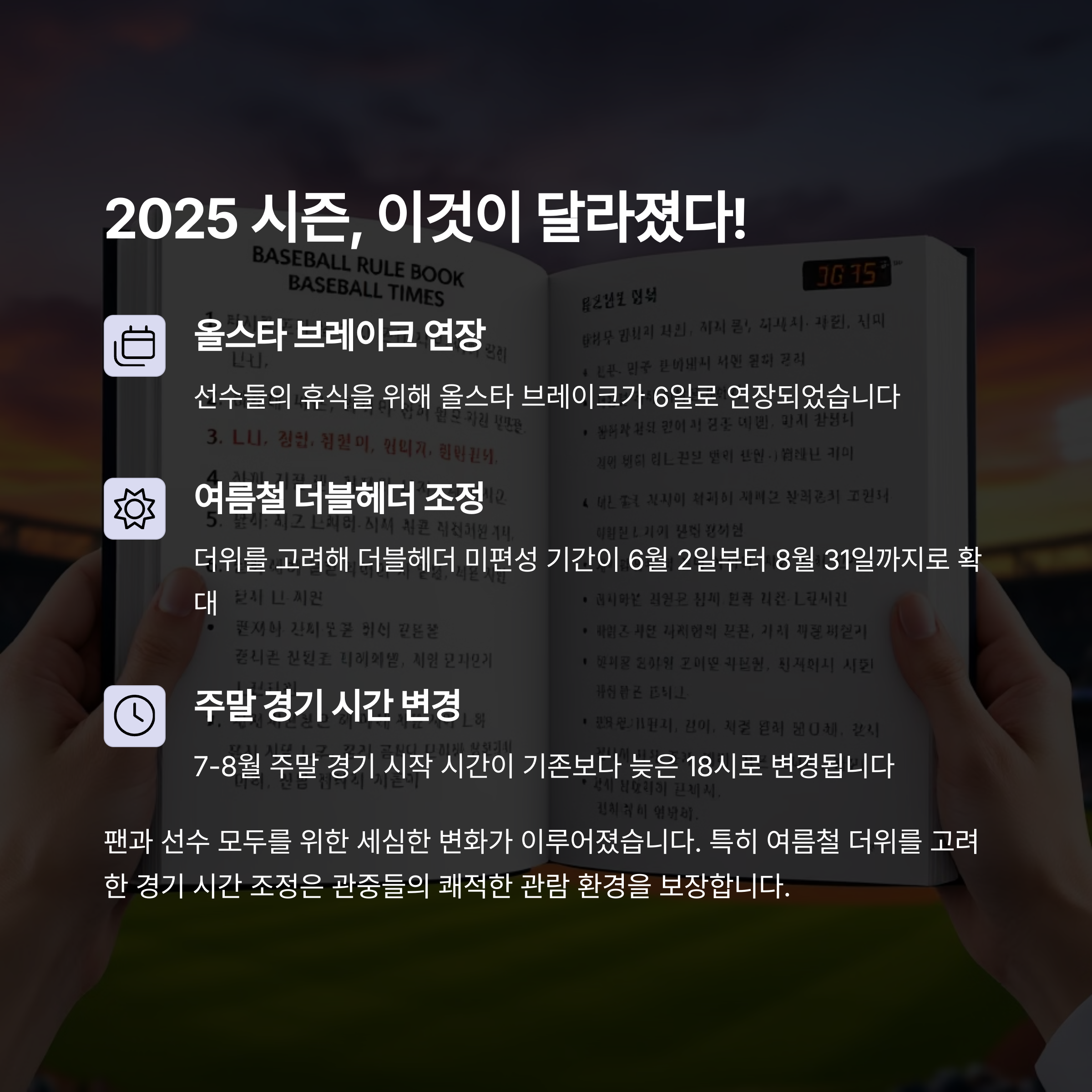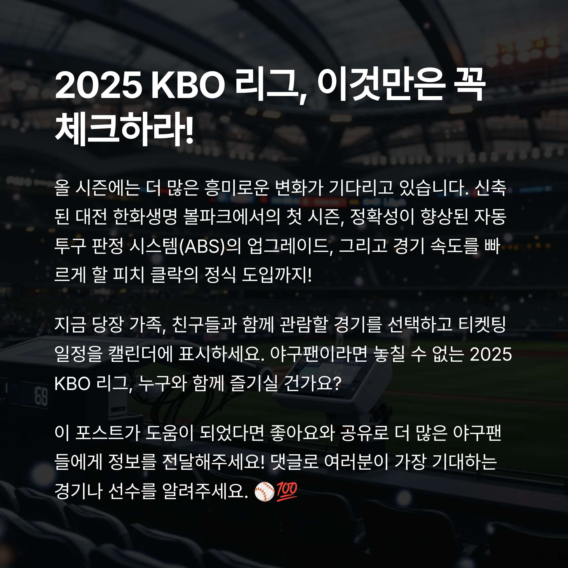 2025년 KBO 리그는 단순한 경기 이상의 의미를 지닙니다. 새로운 규칙과 변화된 전략, 신인 선수들의 출현 등 팬들에게 다양한 볼거리를 제공할 준비를 마쳤습니다. 야구장을 찾는 관중에게도 맛집, 이벤트, 티켓팅 편의까지 세심하게 준비되어 있는 만큼, 올 시즌은 관람의 즐거움도 배가될 것입니다. 올해는 야구장을 한 번쯤 꼭 방문해 보시길 추천드립니다. 열정적인 응원 속에서 함께 시즌의 뜨거운 감동을 나눠보세요.