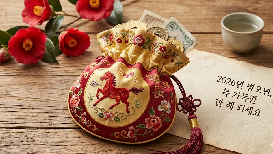 사진 속 탐스러운 복주머니에는 2026년을 상징하는 멋진 붉은 말이 수놓아져 있습니다. 그 옆으로 봄을 알리는 매화꽃과 풍요로움을 상징하는 엽전들이 가득하네요.