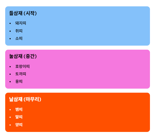 • 날삼재(마무리): 뱀띠 · 말띠 · 양띠