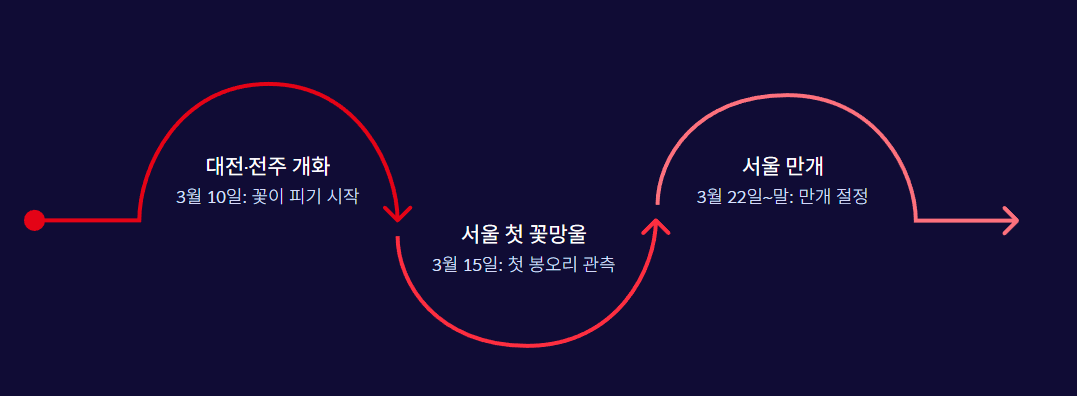 • 서울/인근: 3월 15일경 첫 꽃망울 → 3월 22일 ~ 3월 말 만개 예상