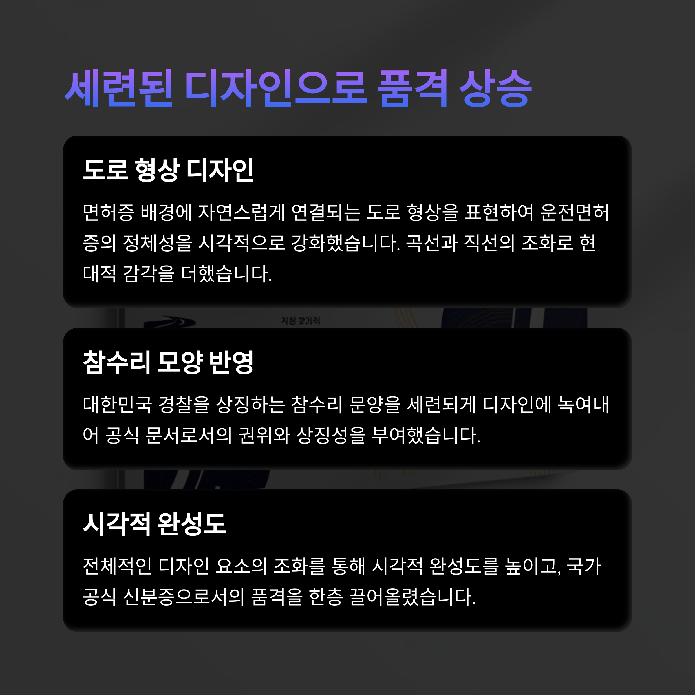 23년 만의 운전면허증 개편은 단순한 디자인의 변화 그 이상입니다. 이번 개정은 보안성을 강화하고 국민 편의를 고려한 전면적인 개선 작업으로, 우리의 일상생활에 큰 영향을 미치고 있습니다. 특히 최근 위조 면허증 사용 사례가 급증하면서 정부와 관계 기관은 보다 정밀하고 정교한 보안기술을 적용할 필요성을 절감하게 되었고, 그 결과가 이번 새로운 면허증에 고스란히 반영되었습니다. 국민들이 실생활에서 더욱 안전하고 신뢰성 있는 면허증을 사용할 수 있도록 하는 것이 이번 정책의 핵심이라 할 수 있습니다.