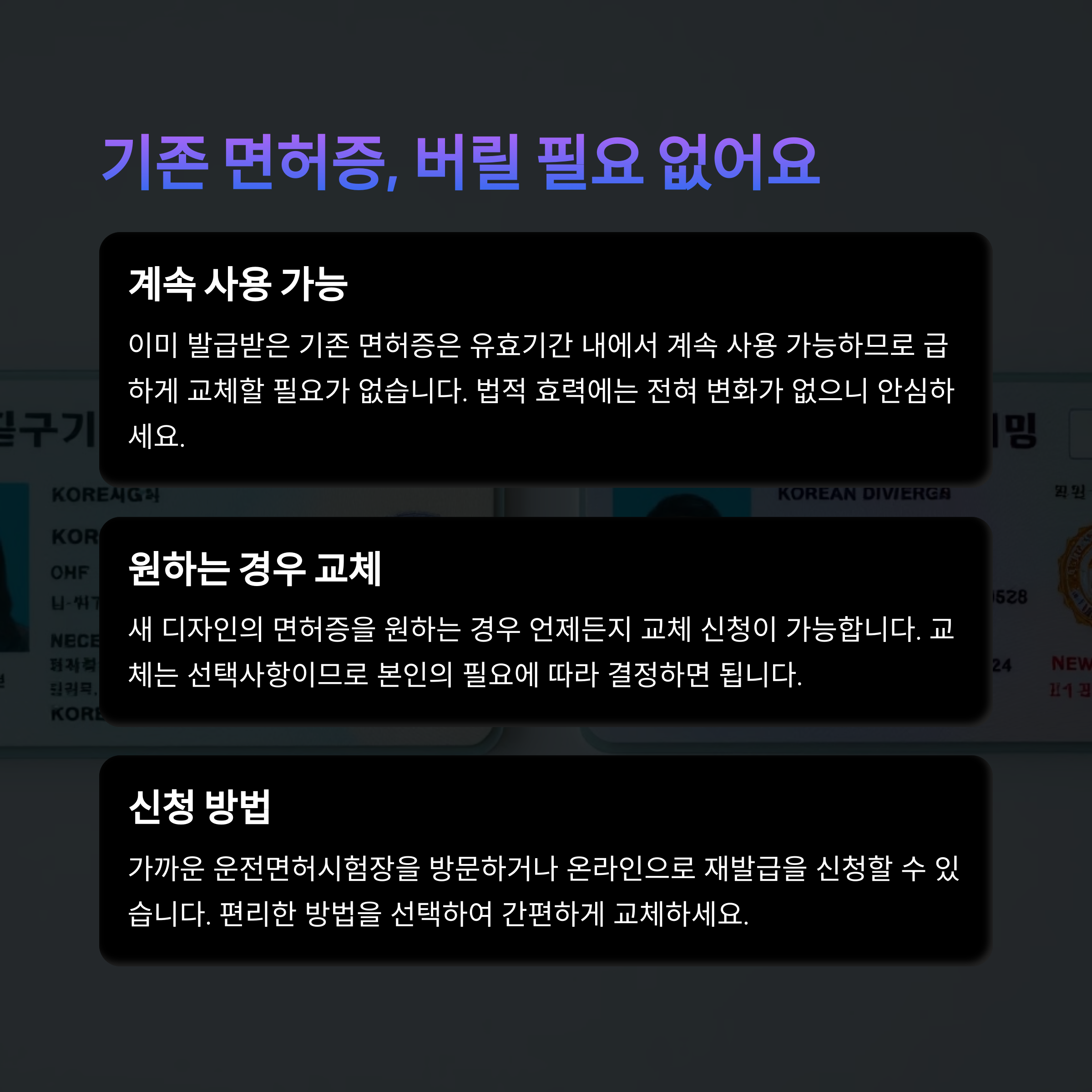 네, 기존 운전면허증도 유효하며 계속 사용할 수 있습니다. 필요 시 운전면허시험장을 방문하거나 온라인으로 새로운 디자인의 면허증을 발급받을 수 있습니다.
