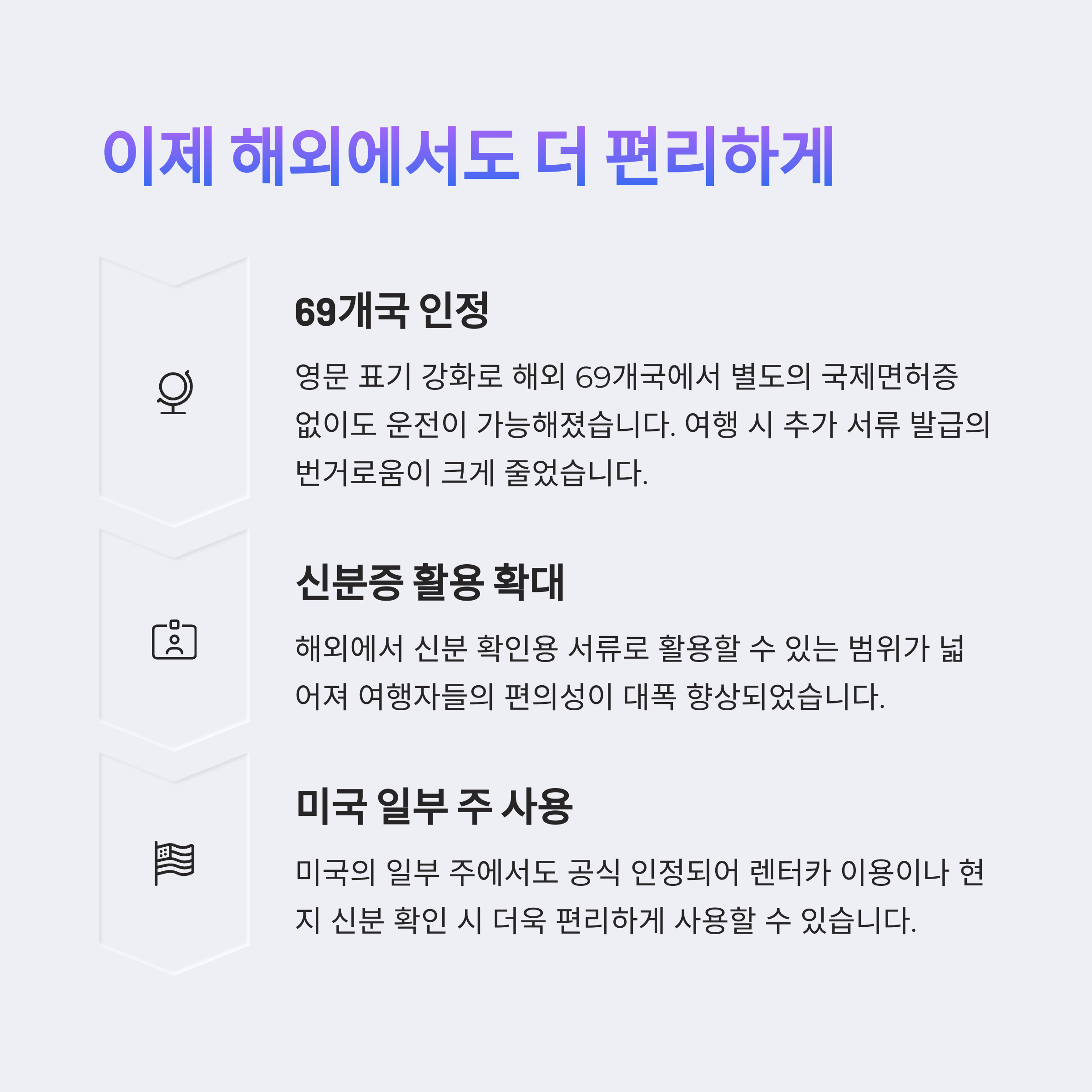 면허증에 이름, 생년월일, 면허종류 등 주요 정보가 영문으로도 명확하게 표기됩니다. 해외에서도 신뢰할 수 있는 신분증으로 활용됩니다.